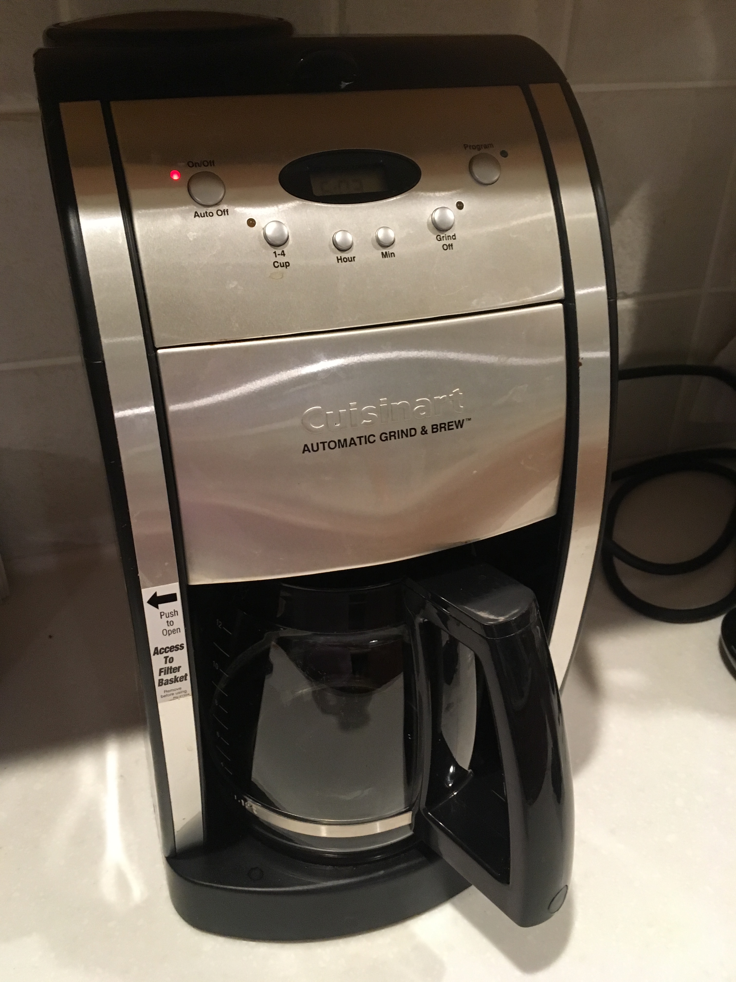 Yesterday morning I poured in water and measured beans into my favorite kitchen appliance: the Grind ‘N’ Brew coffee maker.